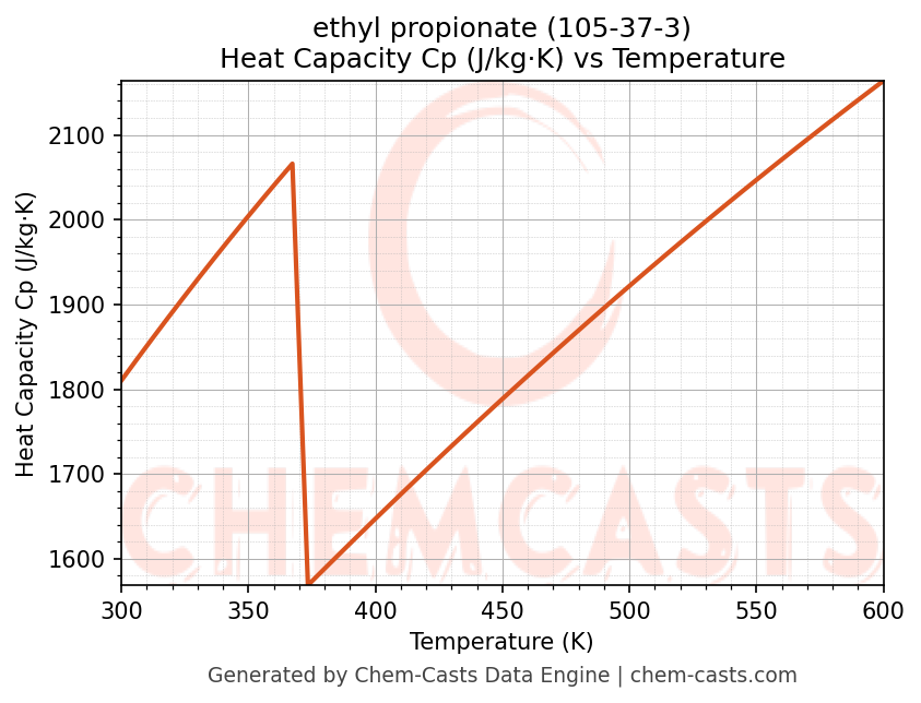- Specific heat capacity (Cp) indicates the amount of energy required to raise the temperature of ethyl propionate and is critical for energy balance and heat-exchanger design.