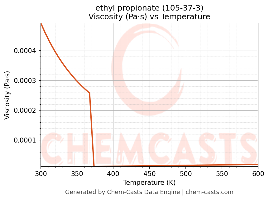 This page presents the temperature-dependent thermodynamic and transport properties of ethyl propionate (CAS 105-37-3) calculated at a constant pressure of 1 atm (101325 Pa) over the temperature range 250-500 K.