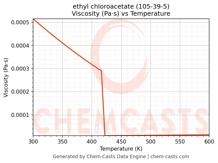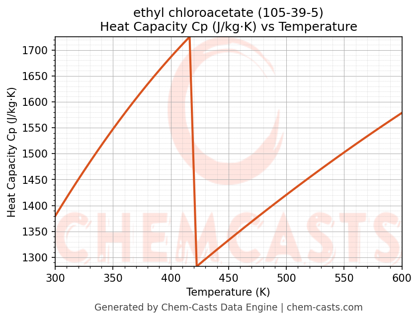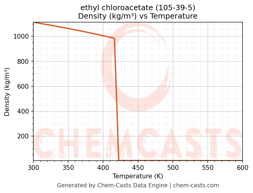 This page presents the temperature-dependent thermodynamic and transport properties of ethyl chloroacetate (CAS 105-39-5) calculated at a constant pressure of 1 atm (101325 Pa) over the temperature range 250-500 K.