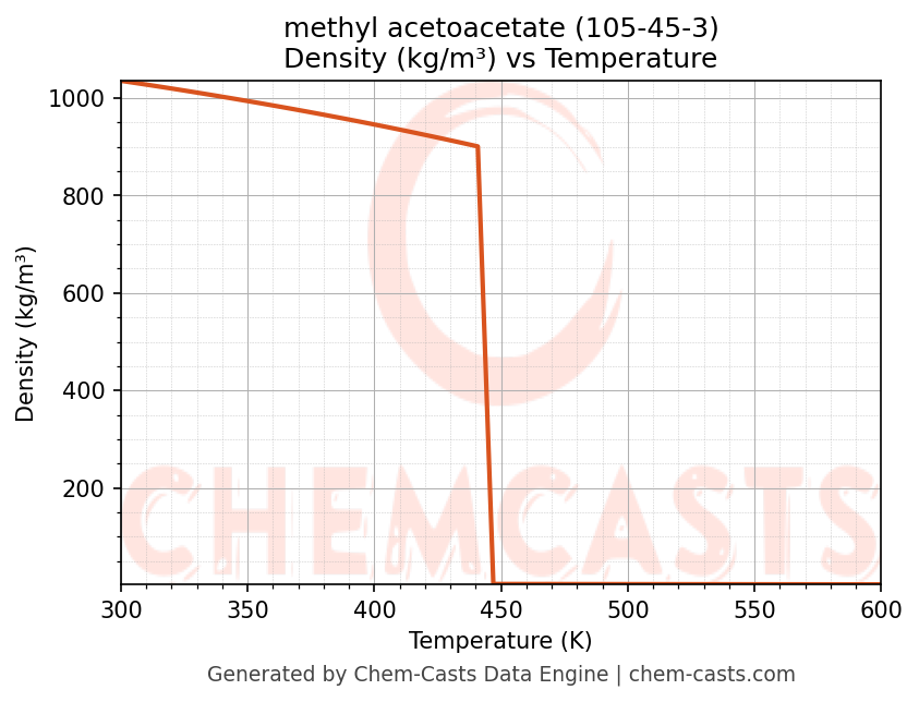 This page presents the temperature-dependent thermodynamic and transport properties of methyl acetoacetate (CAS 105-45-3) calculated at a constant pressure of 1 atm (101325 Pa) over the temperature range 250-500 K.