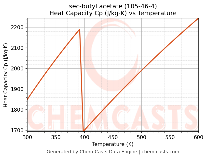 This page presents the temperature-dependent thermodynamic and transport properties of sec-butyl acetate (CAS 105-46-4) calculated at a constant pressure of 1 atm (101325 Pa) over the temperature range 250-500 K.
