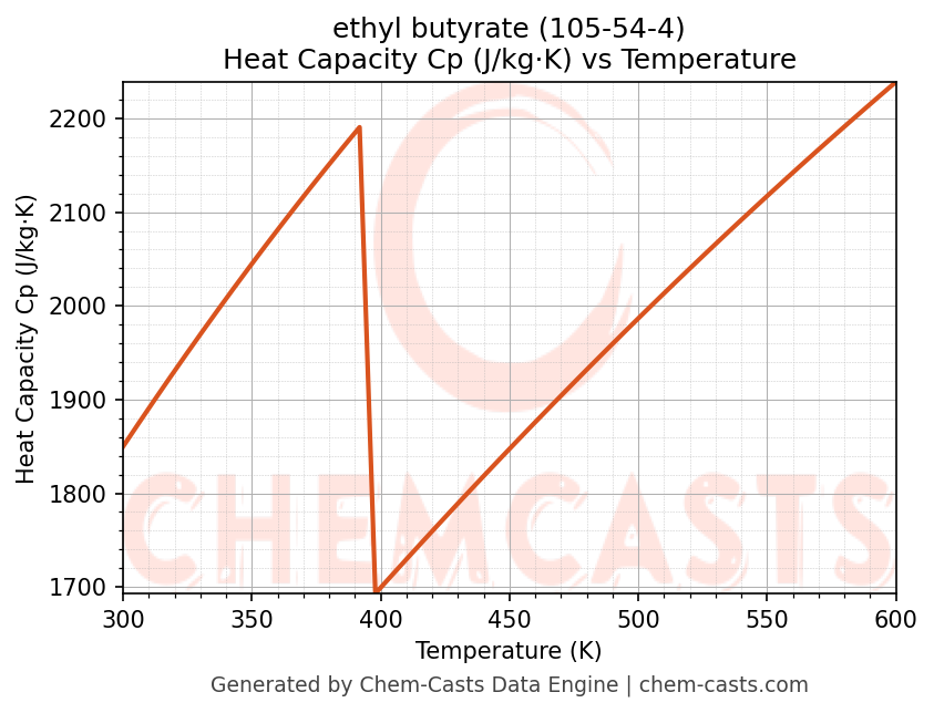 - Specific heat capacity (Cp) indicates the amount of energy required to raise the temperature of ethyl butyrate and is critical for energy balance and heat-exchanger design.