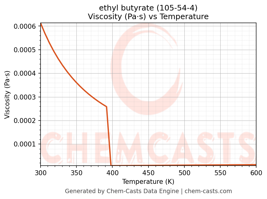 This page presents the temperature-dependent thermodynamic and transport properties of ethyl butyrate (CAS 105-54-4) calculated at a constant pressure of 1 atm (101325 Pa) over the temperature range 250-500 K.