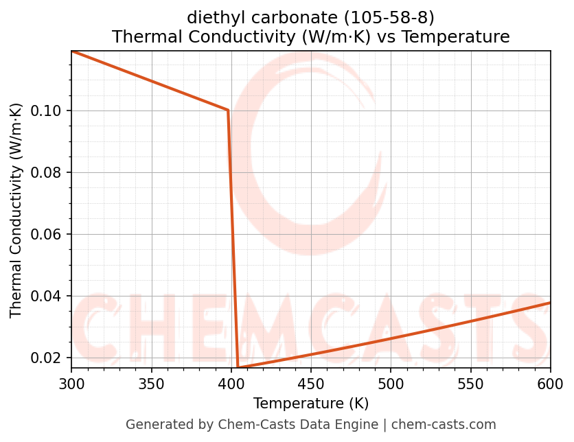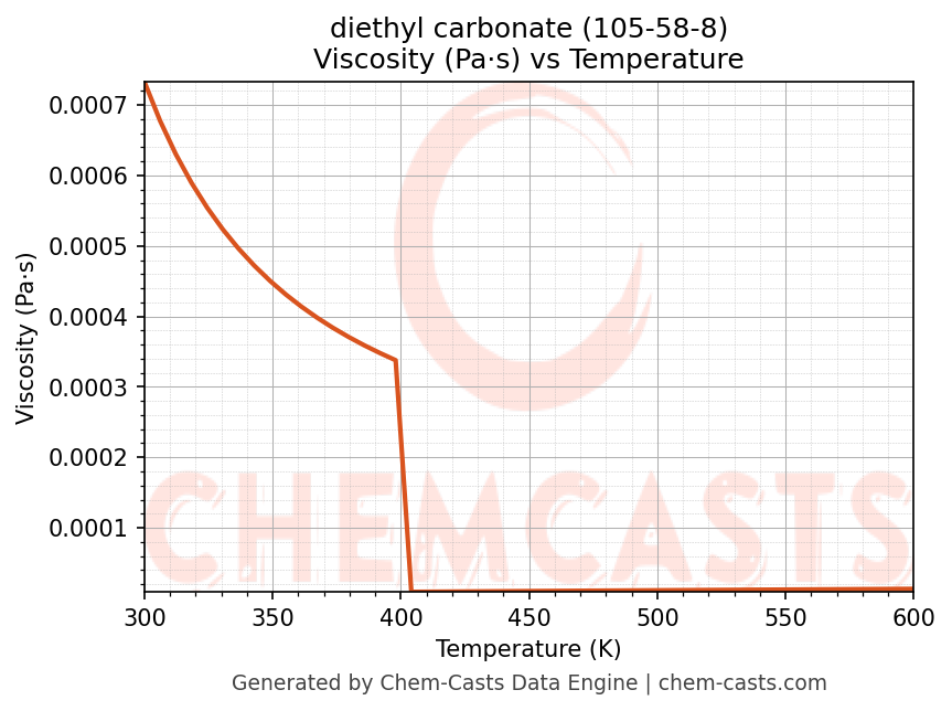 This page presents the temperature-dependent thermodynamic and transport properties of diethyl carbonate (CAS 105-58-8) calculated at a constant pressure of 1 atm (101325 Pa) over the temperature range 250-500 K.