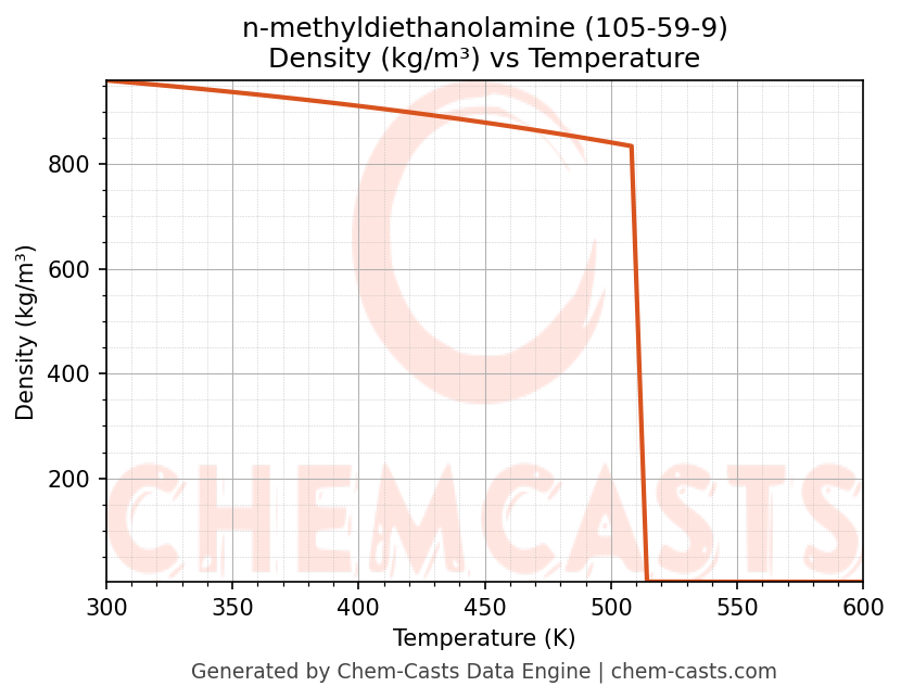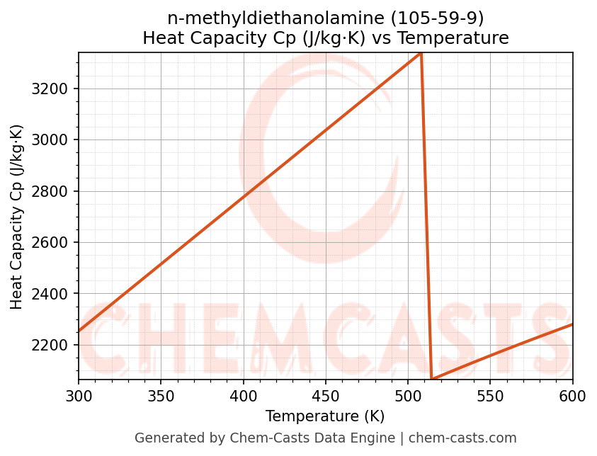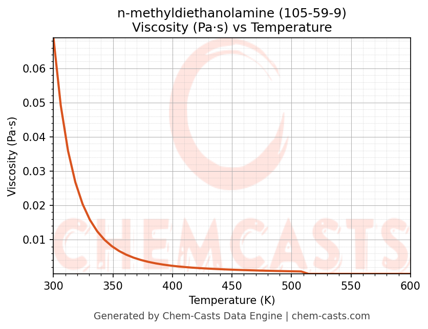 This page presents the temperature-dependent thermodynamic and transport properties of n-methyldiethanolamine (CAS 105-59-9) calculated at a constant pressure of 1 atm (101325 Pa) over the temperature range 250-500 K.