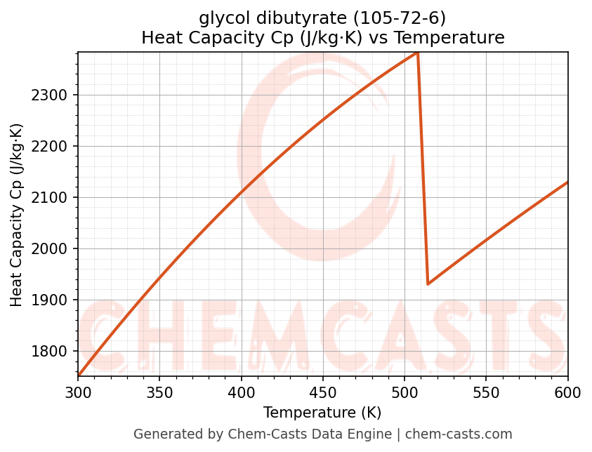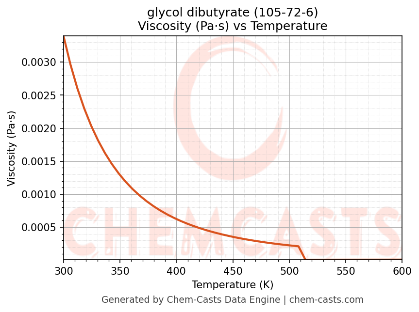 This page presents the temperature-dependent thermodynamic and transport properties of glycol dibutyrate (CAS 105-72-6) calculated at a constant pressure of 1 atm (101325 Pa) over the temperature range 250-500 K.