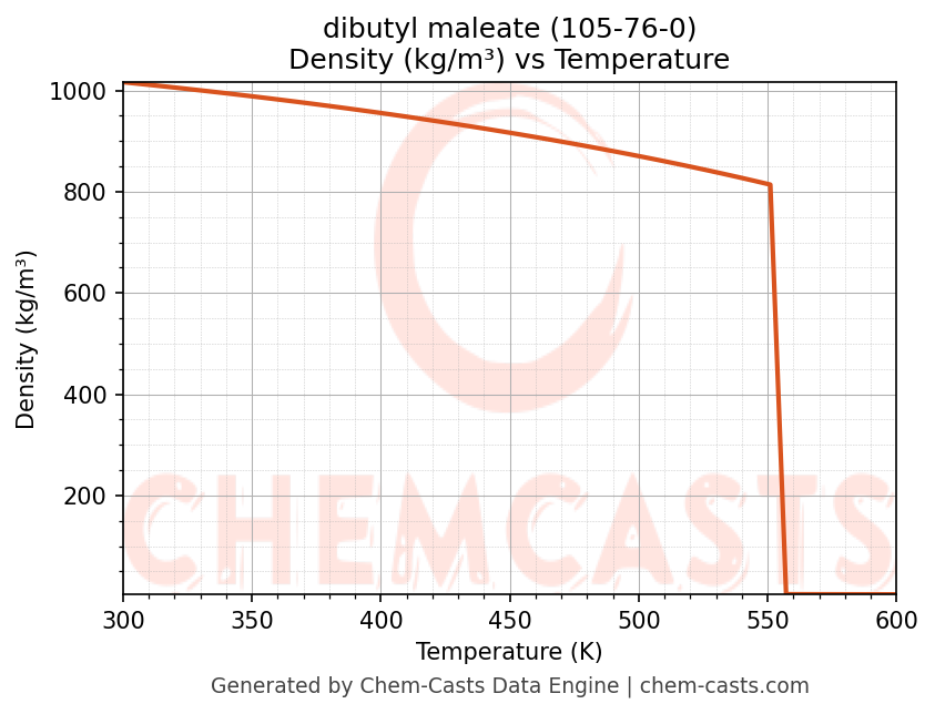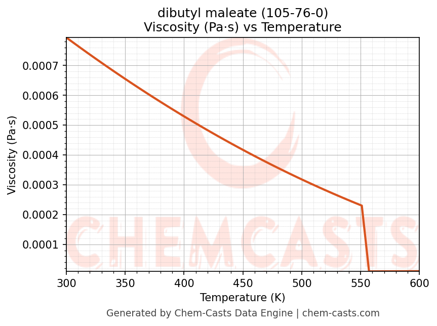 This page presents the temperature-dependent thermodynamic and transport properties of dibutyl maleate (CAS 105-76-0) calculated at a constant pressure of 1 atm (101325 Pa) over the temperature range 250-500 K.