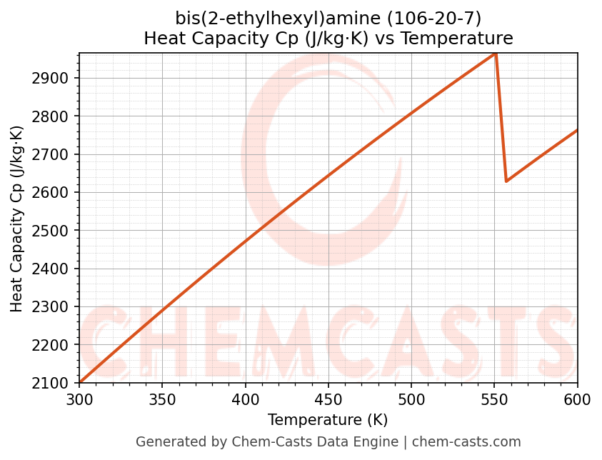 - Specific heat capacity (Cp) indicates the amount of energy required to raise the temperature of bis(2-ethylhexyl)amine and is critical for energy balance and heat-exchanger design.