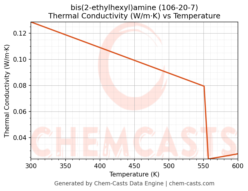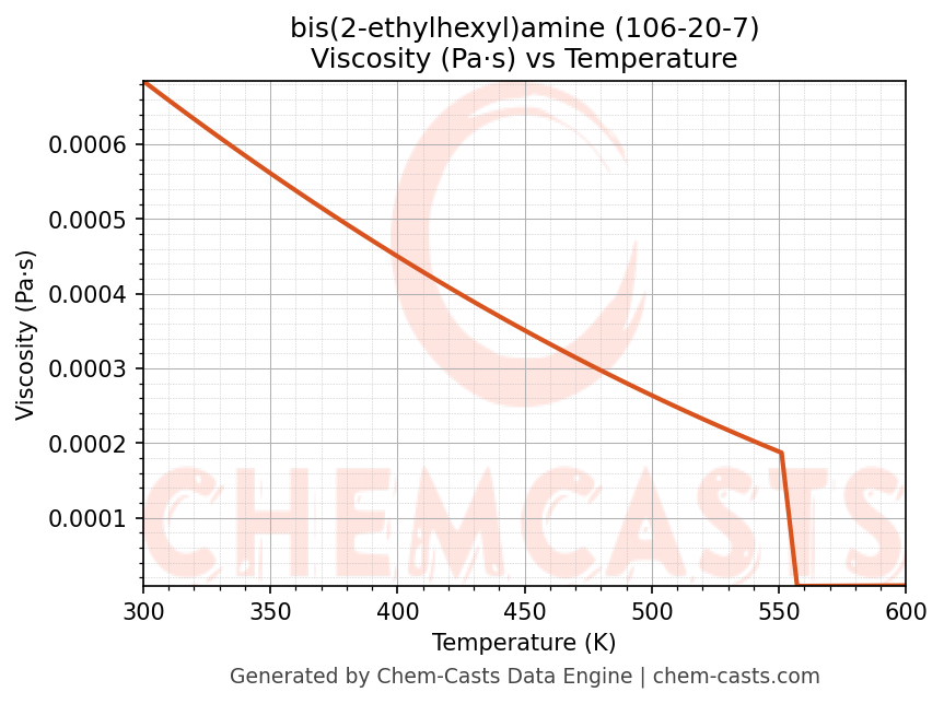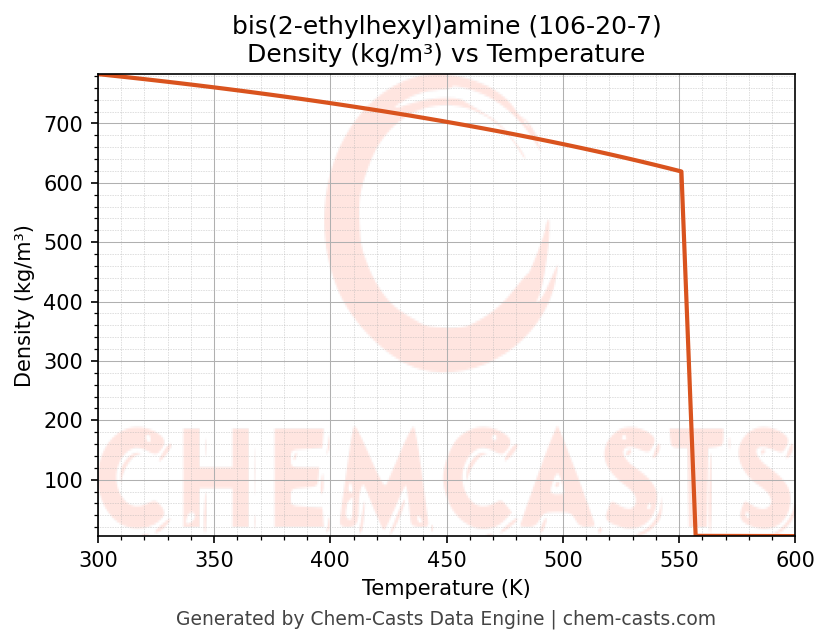 This page presents the temperature-dependent thermodynamic and transport properties of bis(2-ethylhexyl)amine (CAS 106-20-7) calculated at a constant pressure of 1 atm (101325 Pa) over the temperature range 250-500 K.