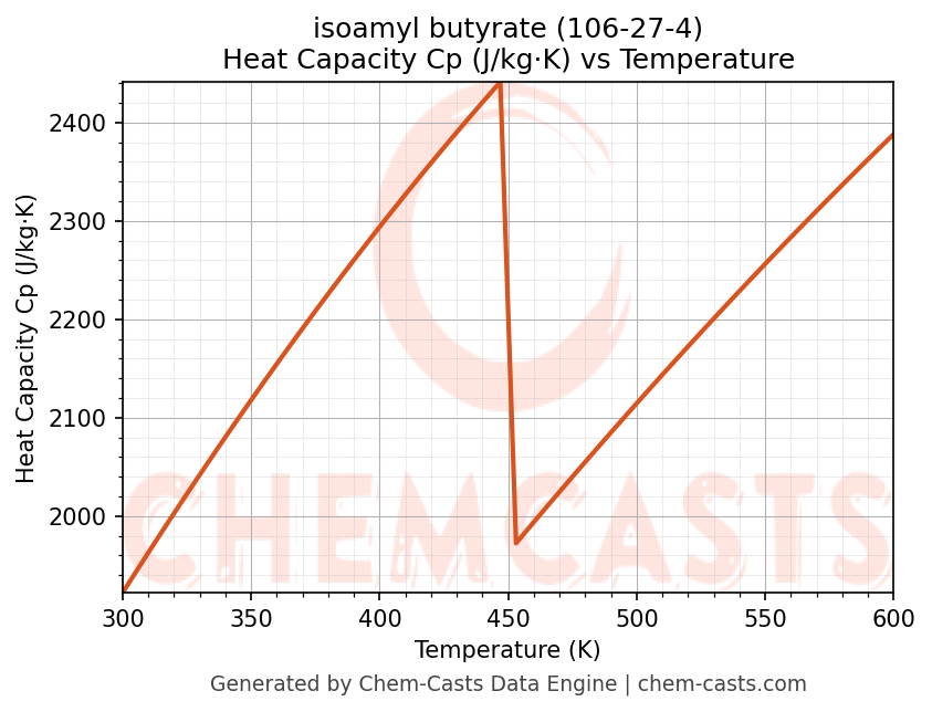 - Specific heat capacity (Cp) indicates the amount of energy required to raise the temperature of isoamyl butyrate and is critical for energy balance and heat-exchanger design.