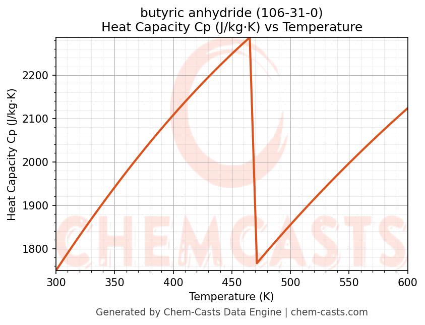 - Specific heat capacity (Cp) indicates the amount of energy required to raise the temperature of butyric anhydride and is critical for energy balance and heat-exchanger design.