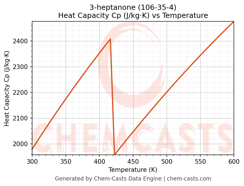 - Specific heat capacity (Cp) indicates the amount of energy required to raise the temperature of 3-heptanone and is critical for energy balance and heat-exchanger design.