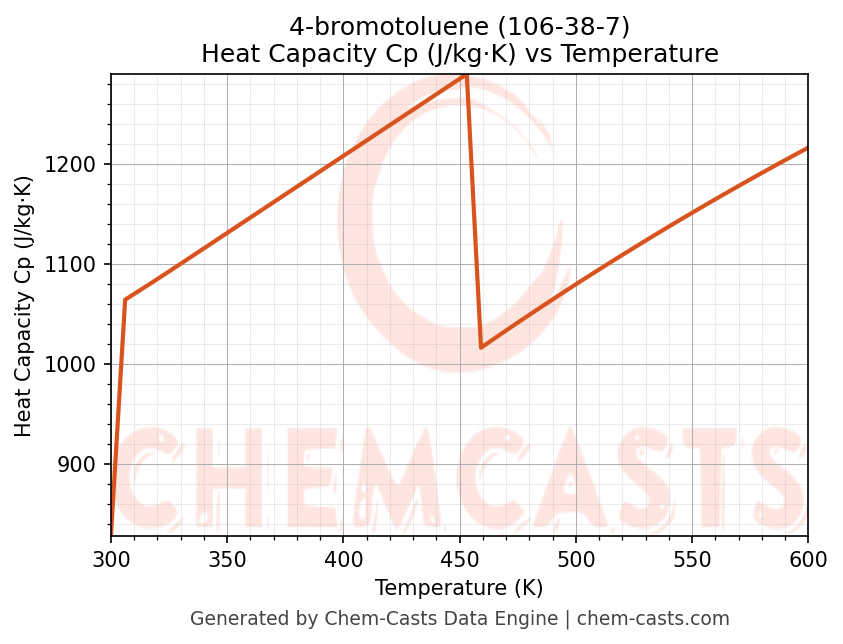 - Specific heat capacity (Cp) indicates the amount of energy required to raise the temperature of 4-bromotoluene and is critical for energy balance and heat-exchanger design.