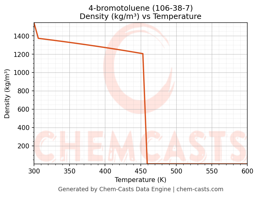 This page presents the temperature-dependent thermodynamic and transport properties of 4-bromotoluene (CAS 106-38-7) calculated at a constant pressure of 1 atm (101325 Pa) over the temperature range 250-500 K.
