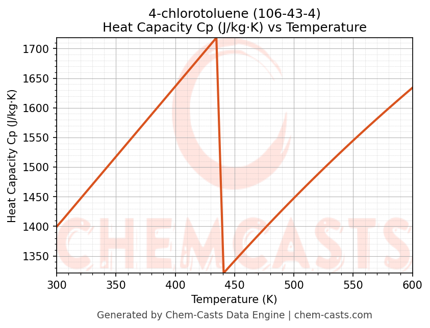 - Specific heat capacity (Cp) indicates the amount of energy required to raise the temperature of 4-chlorotoluene and is critical for energy balance and heat-exchanger design.