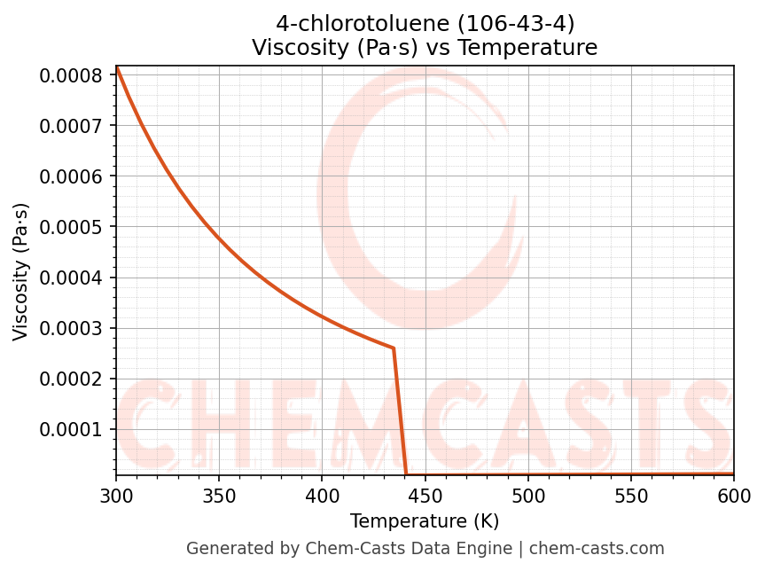 This page presents the temperature-dependent thermodynamic and transport properties of 4-chlorotoluene (CAS 106-43-4) calculated at a constant pressure of 1 atm (101325 Pa) over the temperature range 250-500 K.