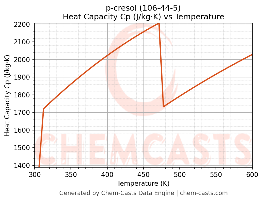 - Specific heat capacity (Cp) indicates the amount of energy required to raise the temperature of p-cresol and is critical for energy balance and heat-exchanger design.