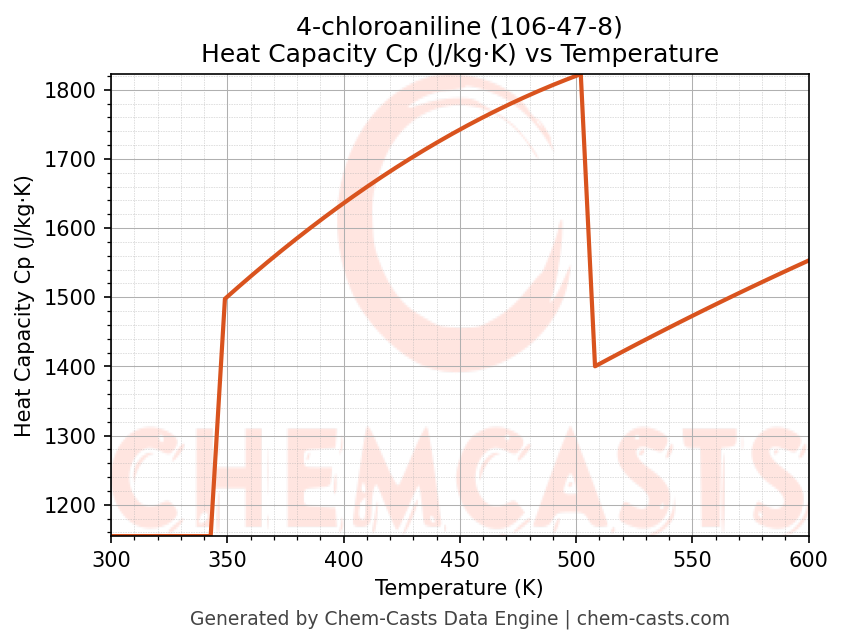 - Specific heat capacity (Cp) indicates the amount of energy required to raise the temperature of 4-chloroaniline and is critical for energy balance and heat-exchanger design.