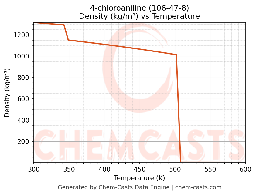 This page presents the temperature-dependent thermodynamic and transport properties of 4-chloroaniline (CAS 106-47-8) calculated at a constant pressure of 1 atm (101325 Pa) over the temperature range 250-500 K.