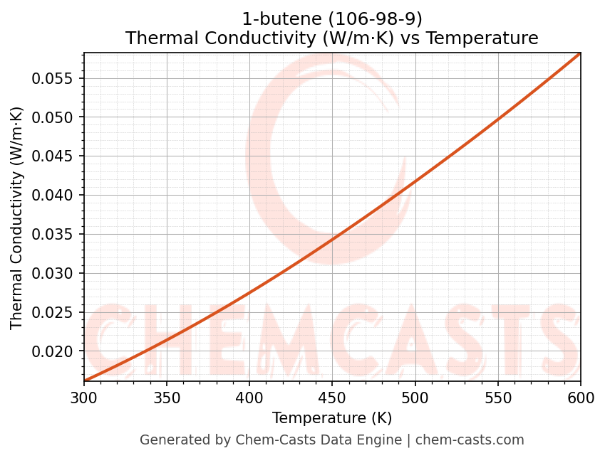 This page presents the temperature-dependent thermodynamic and transport properties of 1-butene (CAS 106-98-9) calculated at a constant pressure of 1 atm (101325 Pa) over the temperature range 250-500 K.