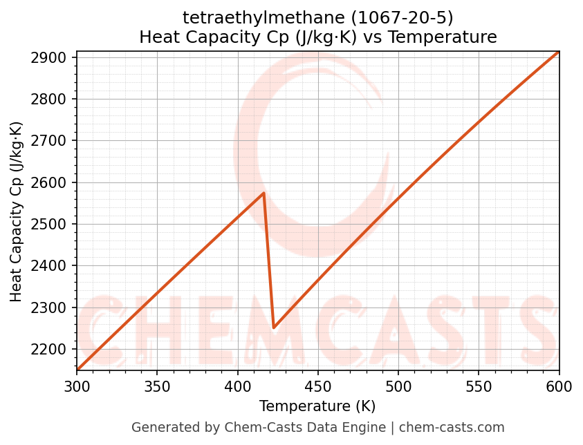 - Specific heat capacity (Cp) indicates the amount of energy required to raise the temperature of tetraethylmethane and is critical for energy balance and heat-exchanger design.
