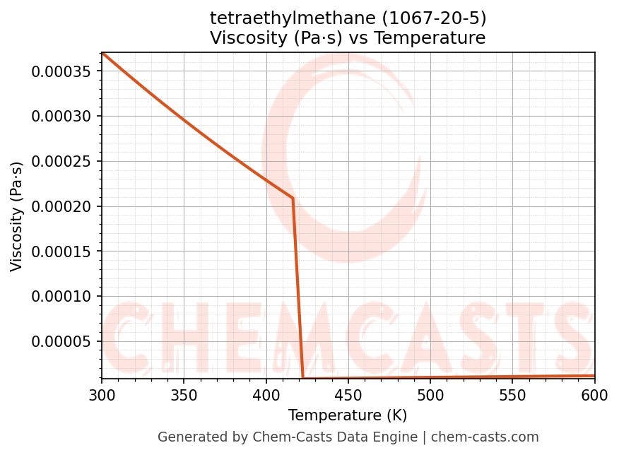 This page presents the temperature-dependent thermodynamic and transport properties of tetraethylmethane (CAS 1067-20-5) calculated at a constant pressure of 1 atm (101325 Pa) over the temperature range 250-500 K.