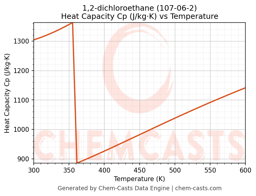 - Specific heat capacity (Cp) indicates the amount of energy required to raise the temperature of 1,2-dichloroethane and is critical for energy balance and heat-exchanger design.