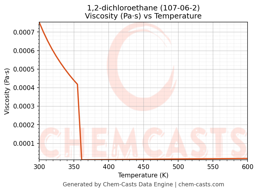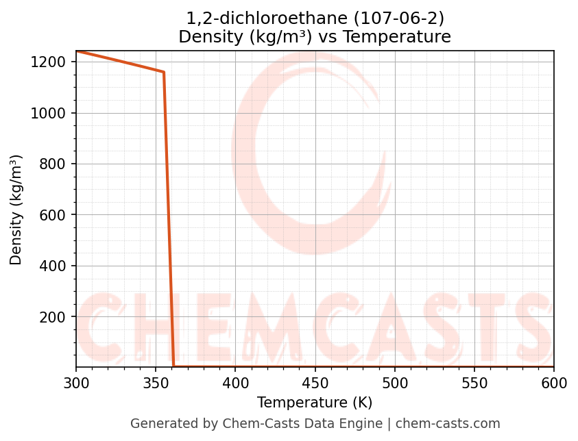 This page presents the temperature-dependent thermodynamic and transport properties of 1,2-dichloroethane (CAS 107-06-2) calculated at a constant pressure of 1 atm (101325 Pa) over the temperature range 250-500 K.