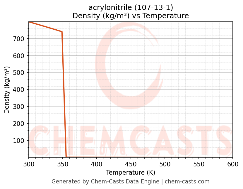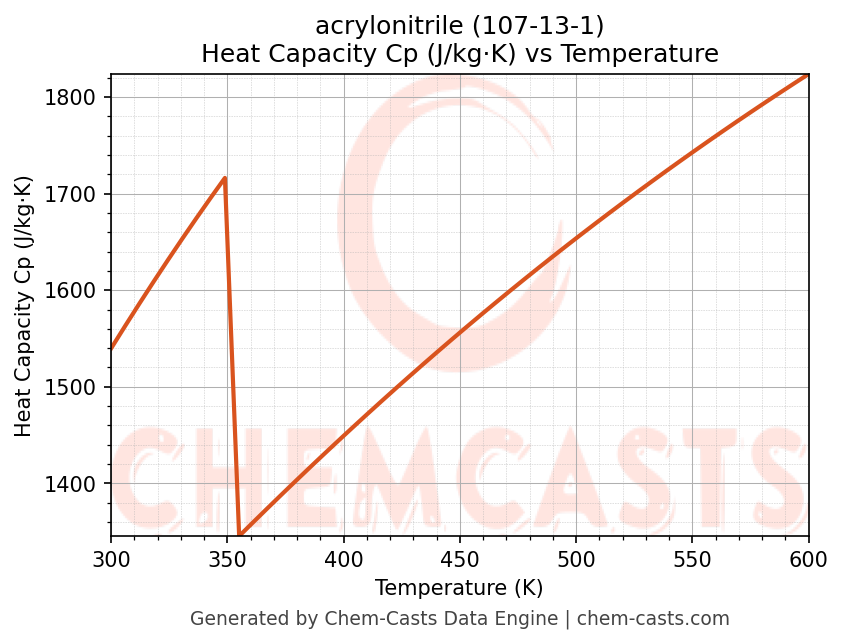 - Specific heat capacity (Cp) indicates the amount of energy required to raise the temperature of acrylonitrile and is critical for energy balance and heat-exchanger design.