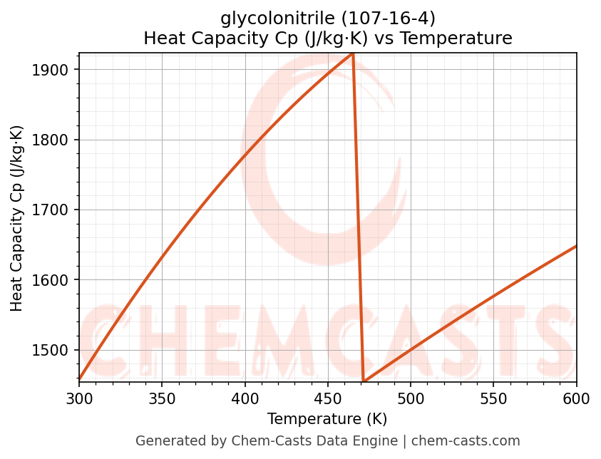 - Specific heat capacity (Cp) indicates the amount of energy required to raise the temperature of glycolonitrile and is critical for energy balance and heat-exchanger design.