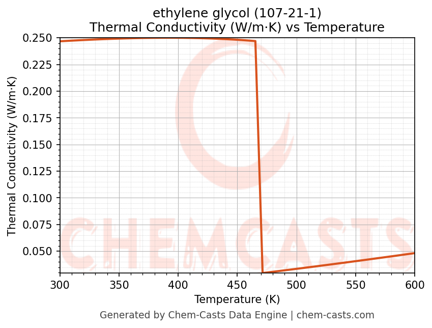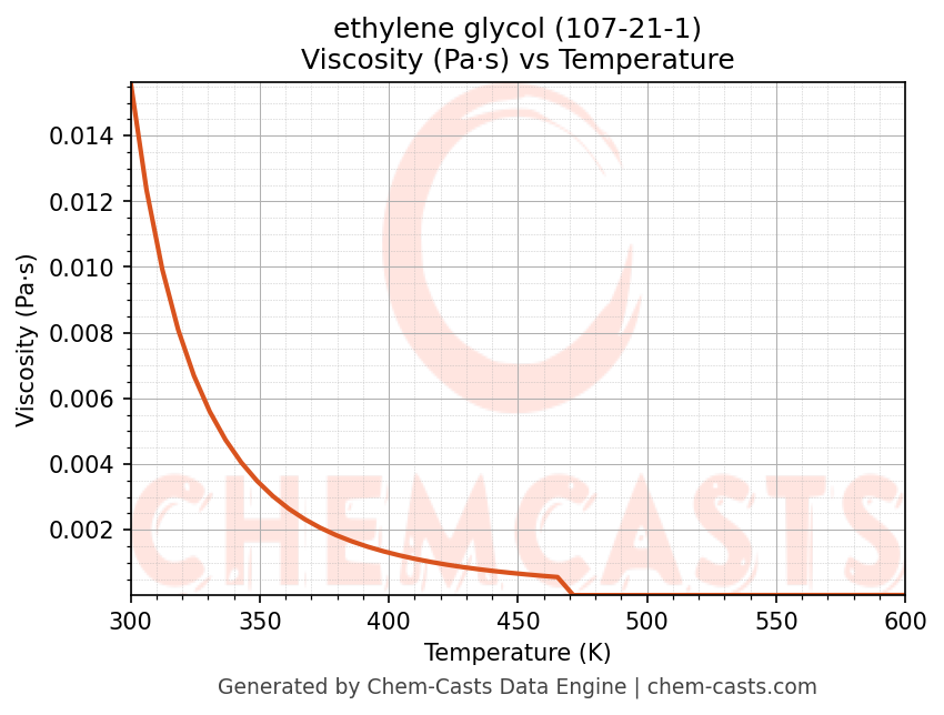 This page presents the temperature-dependent thermodynamic and transport properties of ethylene glycol (CAS 107-21-1) calculated at a constant pressure of 1 atm (101325 Pa) over the temperature range 250-500 K.