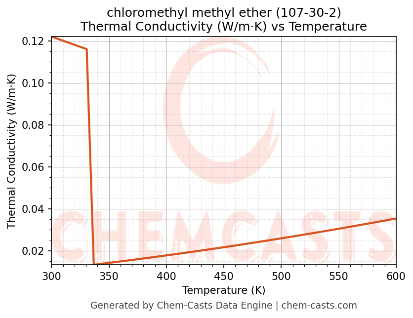 This page presents the temperature-dependent thermodynamic and transport properties of chloromethyl methyl ether (CAS 107-30-2) calculated at a constant pressure of 1 atm (101325 Pa) over the temperature range 250-500 K.