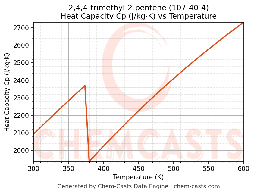 - Specific heat capacity (Cp) indicates the amount of energy required to raise the temperature of 2,4,4-trimethyl-2-pentene and is critical for energy balance and heat-exchanger design.