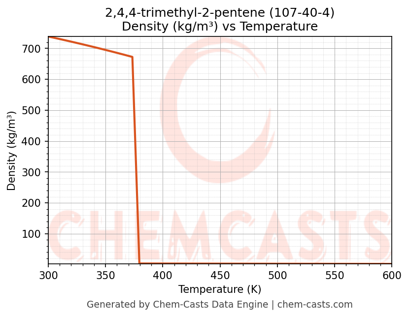 This page presents the temperature-dependent thermodynamic and transport properties of 2,4,4-trimethyl-2-pentene (CAS 107-40-4) calculated at a constant pressure of 1 atm (101325 Pa) over the temperature range 250-500 K.