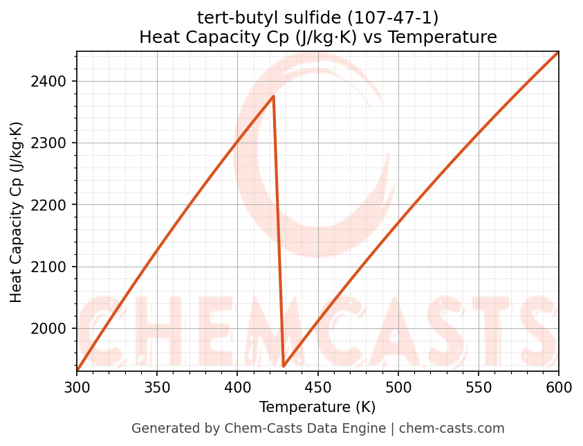 - Specific heat capacity (Cp) indicates the amount of energy required to raise the temperature of tert-butyl sulfide and is critical for energy balance and heat-exchanger design.