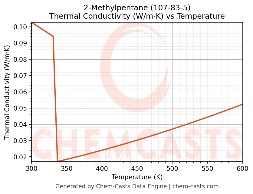 This page presents the temperature-dependent thermodynamic and transport properties of 2-Methylpentane (CAS 107-83-5) calculated at a constant pressure of 1 atm (101325 Pa) over the temperature range 250-500 K.