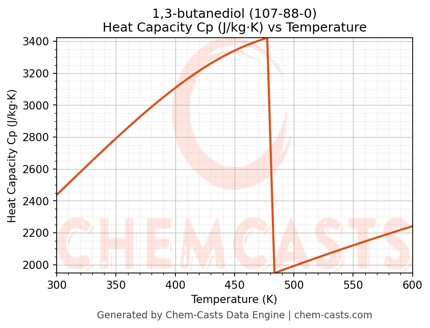- Specific heat capacity (Cp) indicates the amount of energy required to raise the temperature of 1,3-butanediol and is critical for energy balance and heat-exchanger design.
