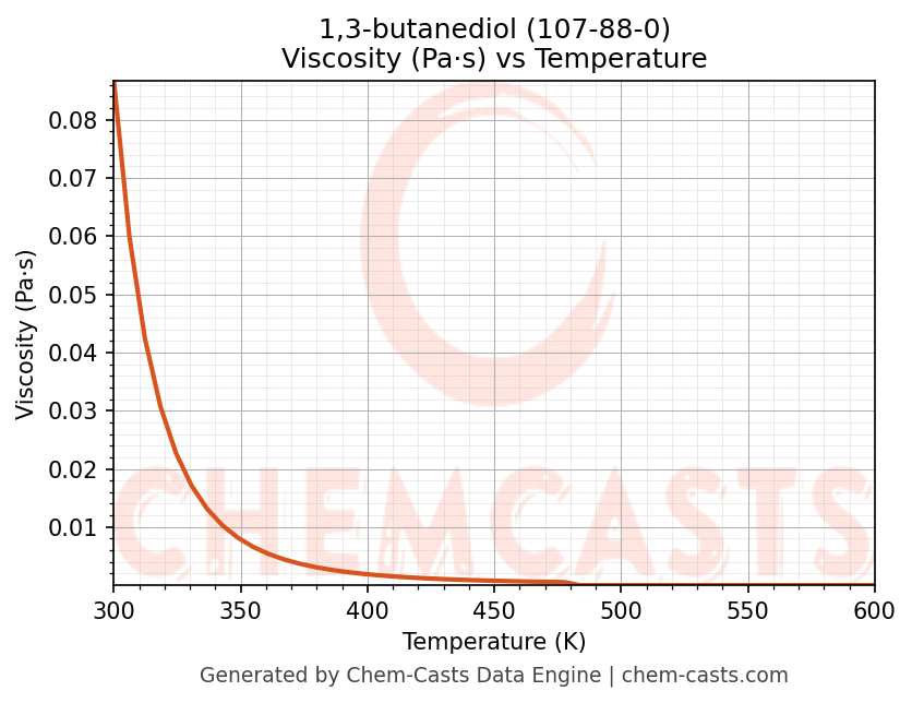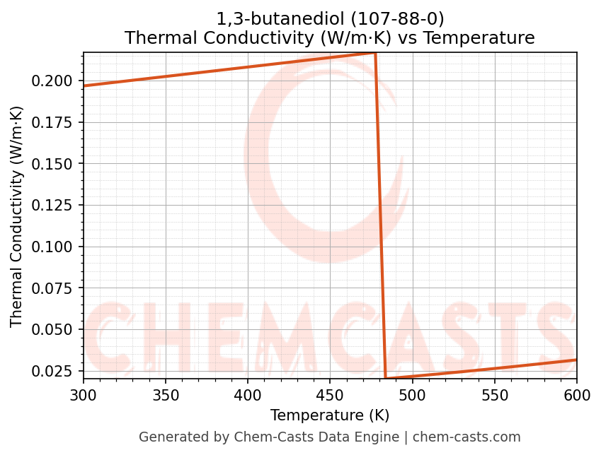 This page presents the temperature-dependent thermodynamic and transport properties of 1,3-butanediol (CAS 107-88-0) calculated at a constant pressure of 1 atm (101325 Pa) over the temperature range 250-500 K.