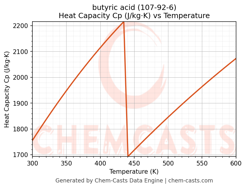 - Specific heat capacity (Cp) indicates the amount of energy required to raise the temperature of butyric acid and is critical for energy balance and heat-exchanger design.