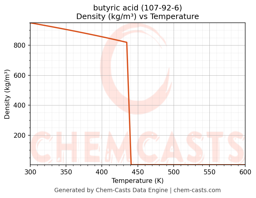 This page presents the temperature-dependent thermodynamic and transport properties of butyric acid (CAS 107-92-6) calculated at a constant pressure of 1 atm (101325 Pa) over the temperature range 250-500 K.