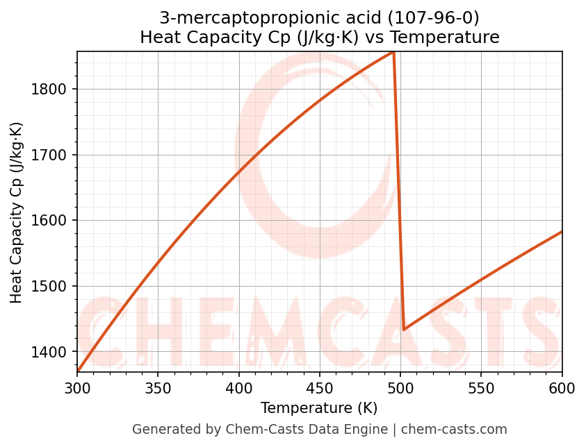 - Specific heat capacity (Cp) indicates the amount of energy required to raise the temperature of 3-mercaptopropionic acid and is critical for energy balance and heat-exchanger design.