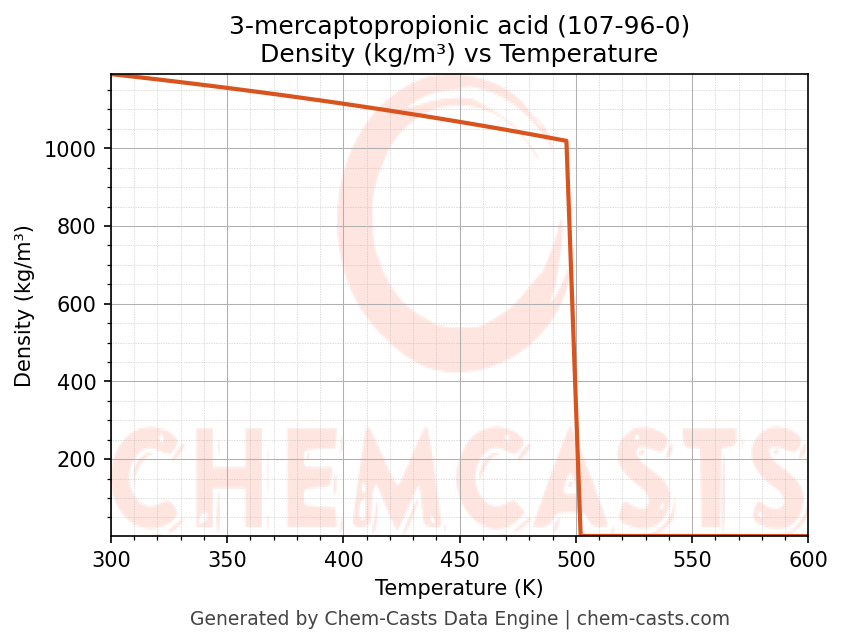 This page presents the temperature-dependent thermodynamic and transport properties of 3-mercaptopropionic acid (CAS 107-96-0) calculated at a constant pressure of 1 atm (101325 Pa) over the temperature range 250-500 K.