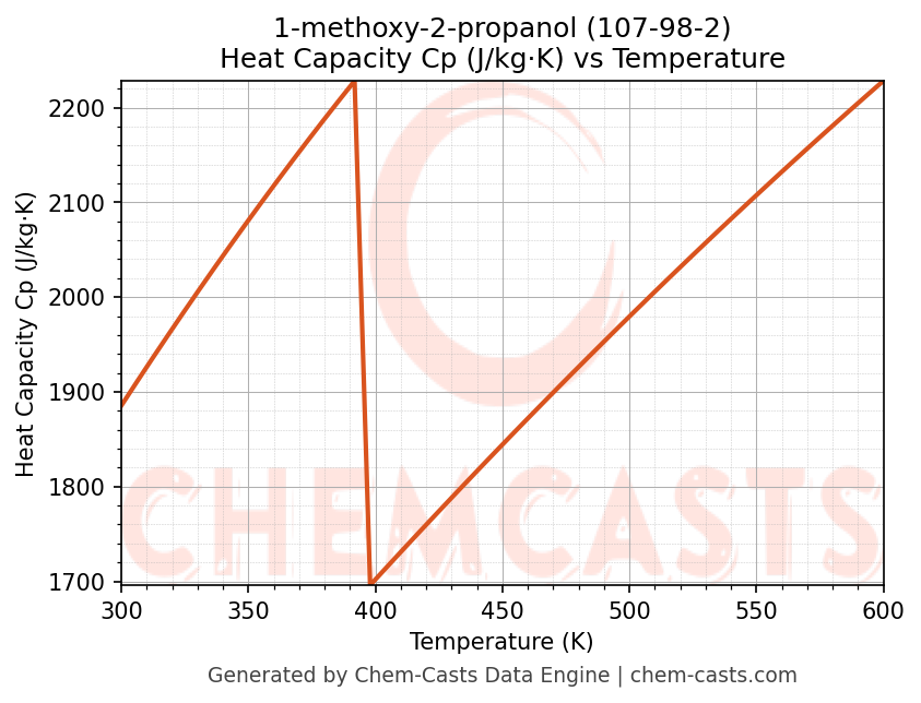 - Specific heat capacity (Cp) indicates the amount of energy required to raise the temperature of 1-methoxy-2-propanol and is critical for energy balance and heat-exchanger design.