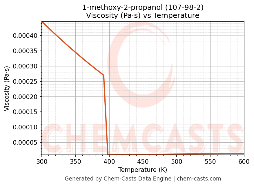 This page presents the temperature-dependent thermodynamic and transport properties of 1-methoxy-2-propanol (CAS 107-98-2) calculated at a constant pressure of 1 atm (101325 Pa) over the temperature range 250-500 K.