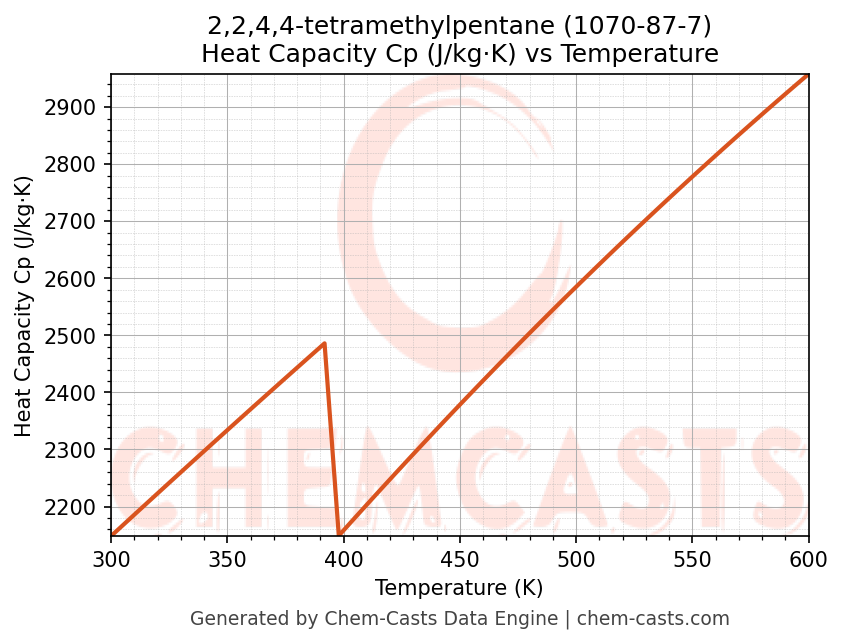 - Specific heat capacity (Cp) indicates the amount of energy required to raise the temperature of 2,2,4,4-tetramethylpentane and is critical for energy balance and heat-exchanger design.