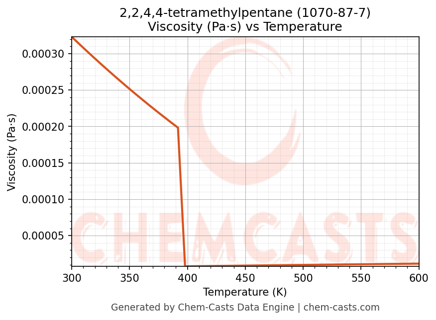 This page presents the temperature-dependent thermodynamic and transport properties of 2,2,4,4-tetramethylpentane (CAS 1070-87-7) calculated at a constant pressure of 1 atm (101325 Pa) over the temperature range 250-500 K.