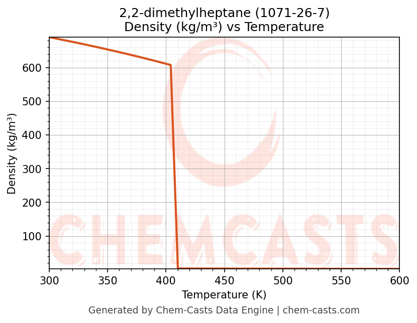 This page presents the temperature-dependent thermodynamic and transport properties of 2,2-dimethylheptane (CAS 1071-26-7) calculated at a constant pressure of 1 atm (101325 Pa) over the temperature range 250-500 K.