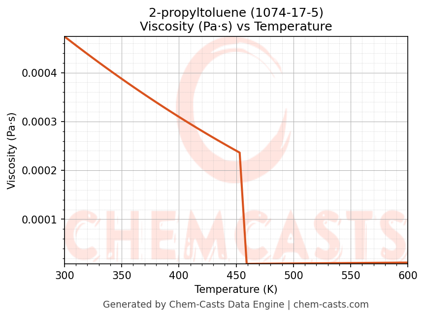 This page presents the temperature-dependent thermodynamic and transport properties of 2-propyltoluene (CAS 1074-17-5) calculated at a constant pressure of 1 atm (101325 Pa) over the temperature range 250-500 K.