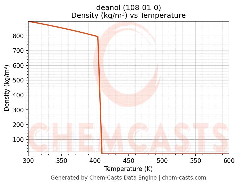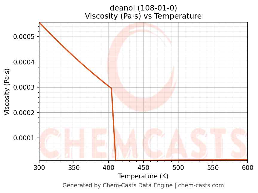 This page presents the temperature-dependent thermodynamic and transport properties of deanol (CAS 108-01-0) calculated at a constant pressure of 1 atm (101325 Pa) over the temperature range 250-500 K.