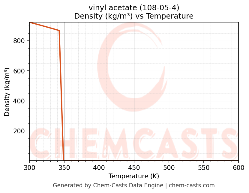 This page presents the temperature-dependent thermodynamic and transport properties of vinyl acetate (CAS 108-05-4) calculated at a constant pressure of 1 atm (101325 Pa) over the temperature range 250-500 K.